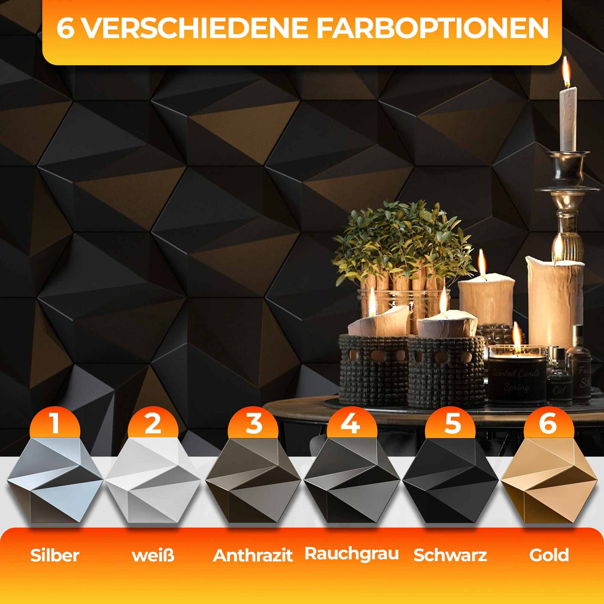 Our exclusive and classy product 3D Wall Zeta places emphasis on your wall. The luxurious product stands out from the common wall panels and creates a unique wall design. The wall panel Zeta is available in the colours black, smoke (dark grey), white, silver and gold. The single colours can be applied single or combined. These 3D panels can be applied in different angles to create different shadings. You determine yourself which pattern you would like to present on your wall. Feel free to be creative and provide your wall with an incredible look.