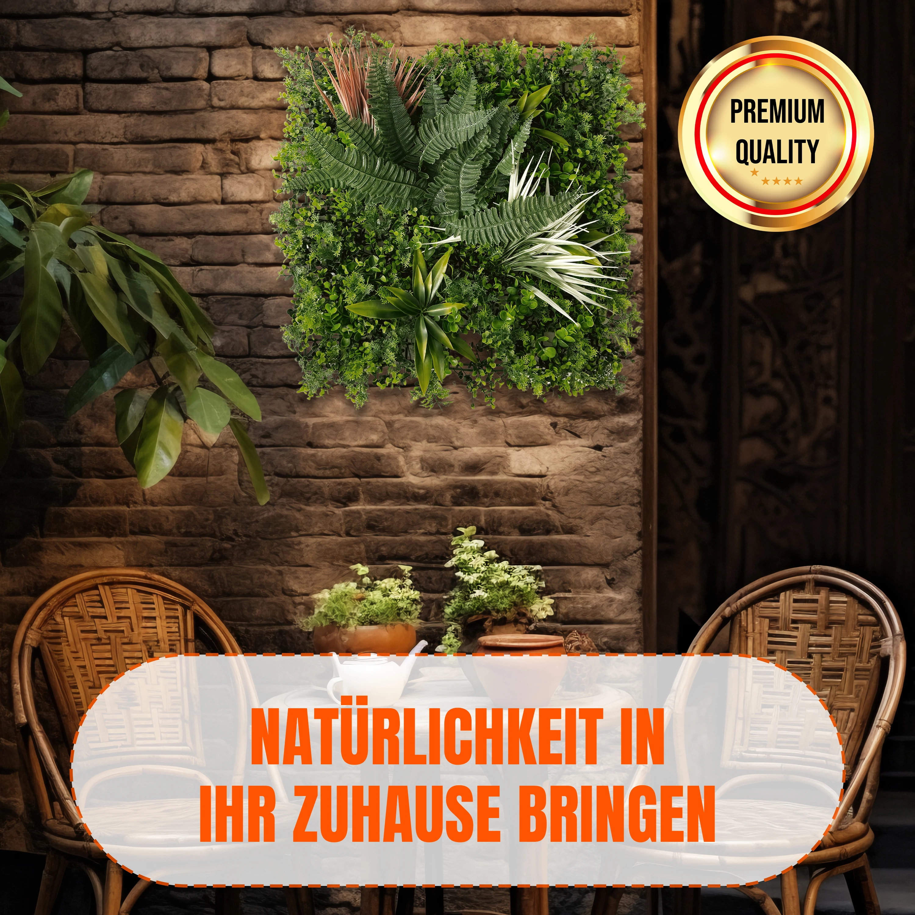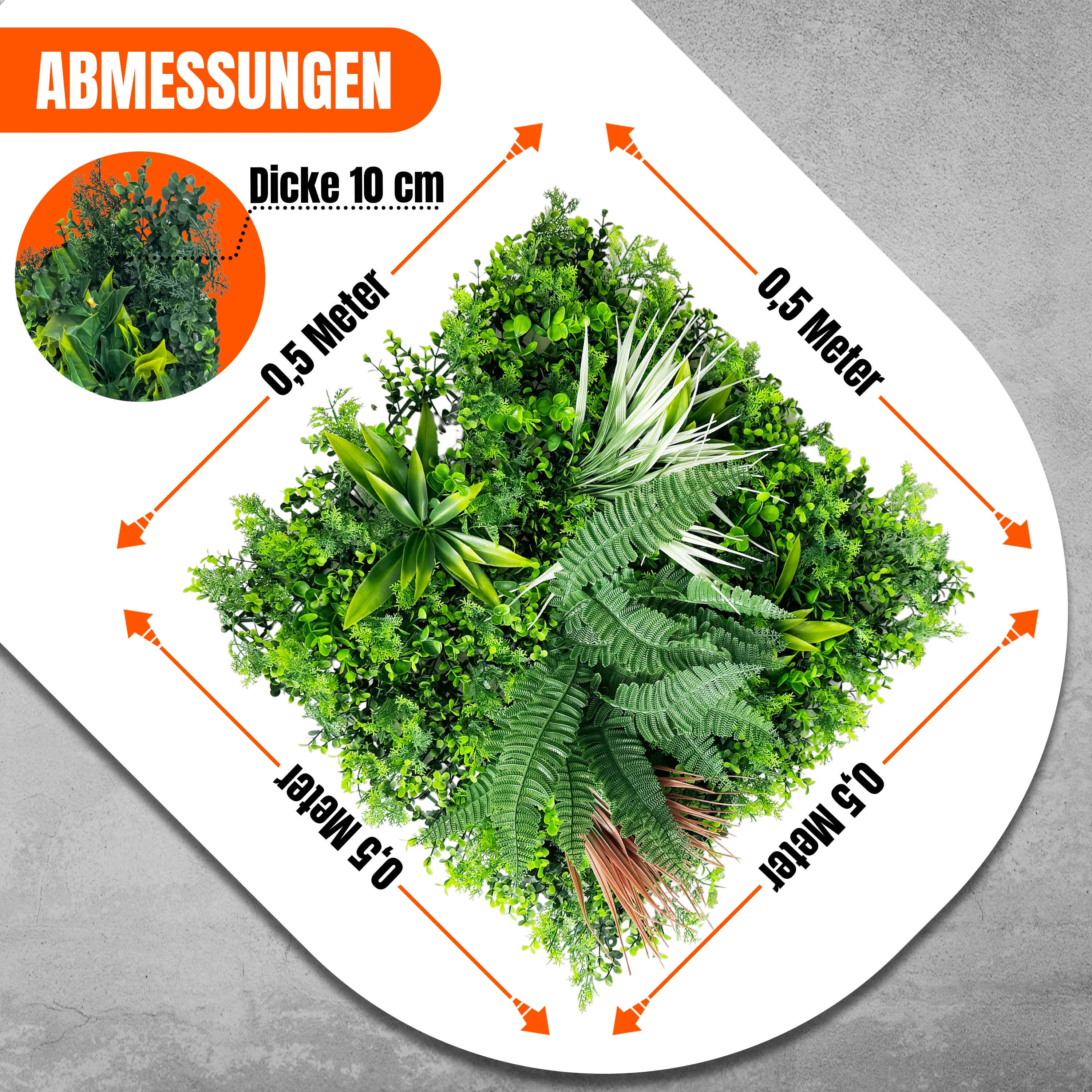 Die Kunsthecke "Wald" zeichnet sich durch eine bunte Mischung aus künstlichen Pflanzen, Gräsern und Blättern aus, die zusammen ein harmonisches und lebendiges Gesamtbild ergeben. In der Farbe Wald präsentiert sich diese Wandverkleidung als ein wahres Meisterwerk der Dekoration, das jede Wandfläche in einen Blickfang verwandelt.