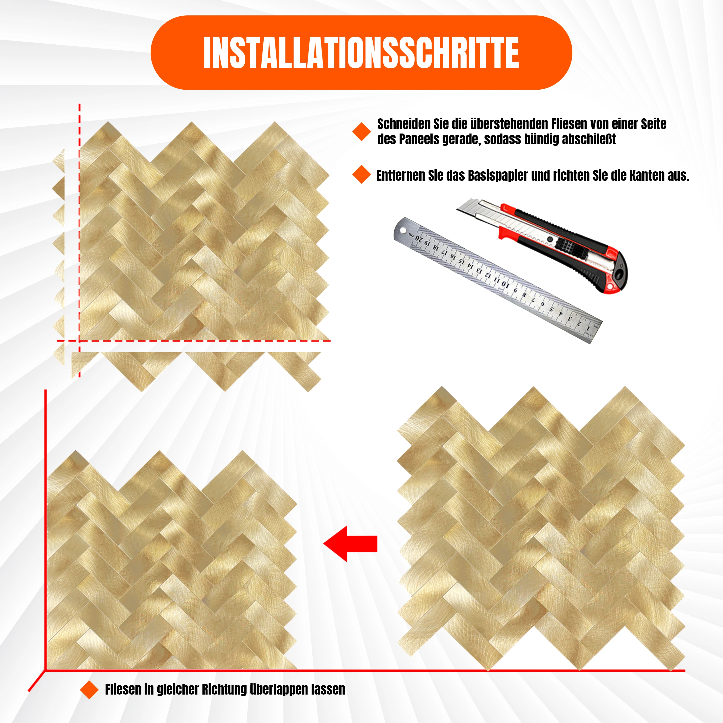 Unsere hochwertige Mosaikfliese "WJS-476" beeindruckt durch ein raffiniertes Chevron-Muster und einen luxuriösen, goldenen Farbton. Die rechteckigen Elemente in Goldtönen verleihen jedem Raum eine elegante und edle Ausstrahlung.