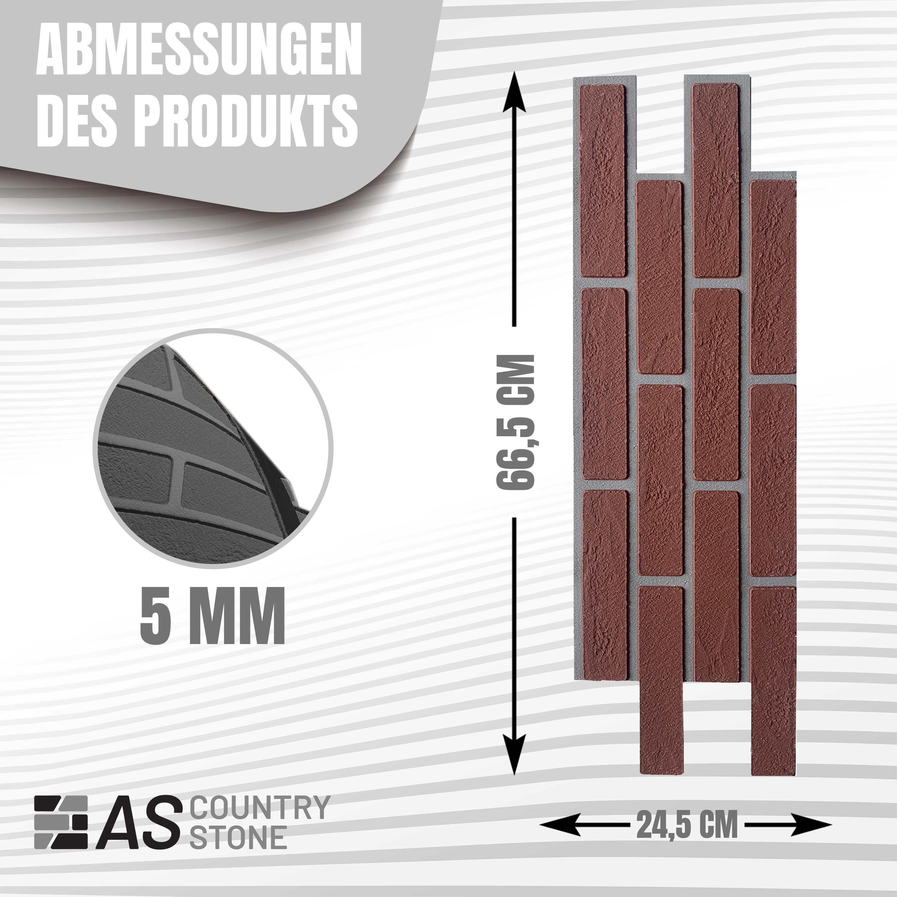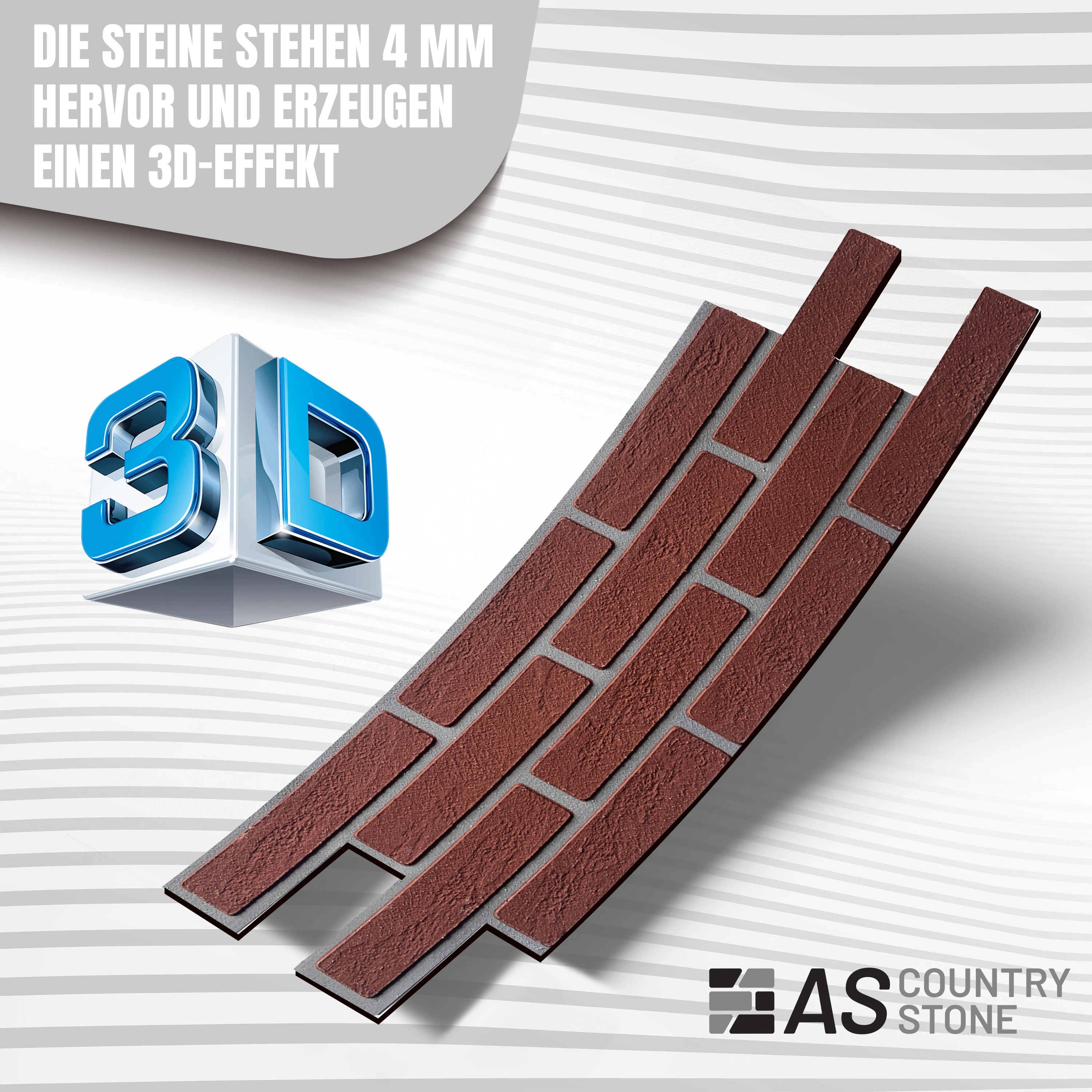 | Surface: | 3D clinker, sticks out by 4 mm, stone structure, weatherproof |