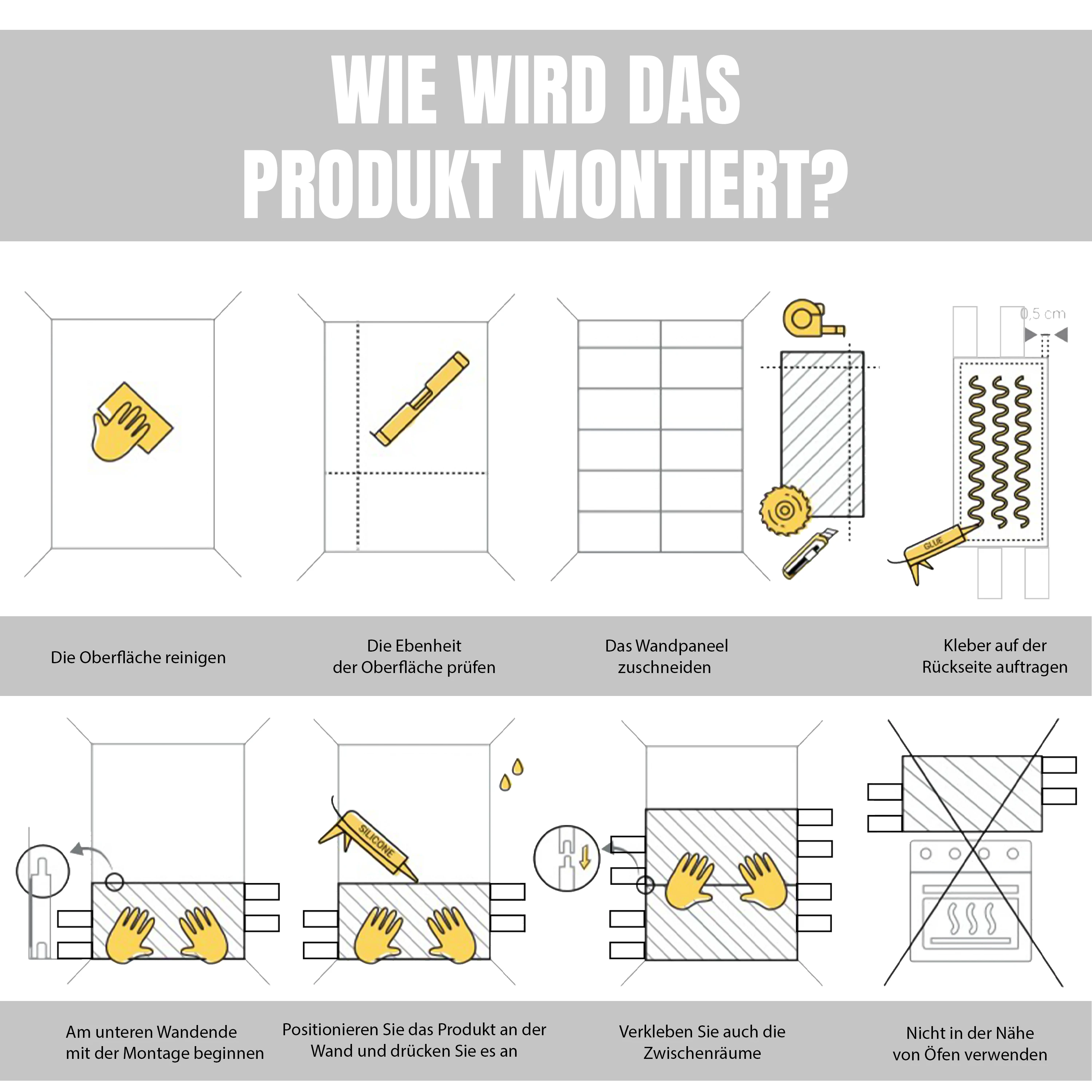 | Required mounting accessories: | adhesive, caulking gun, cutter knife/box cutter, measuring tape, pen, water level |